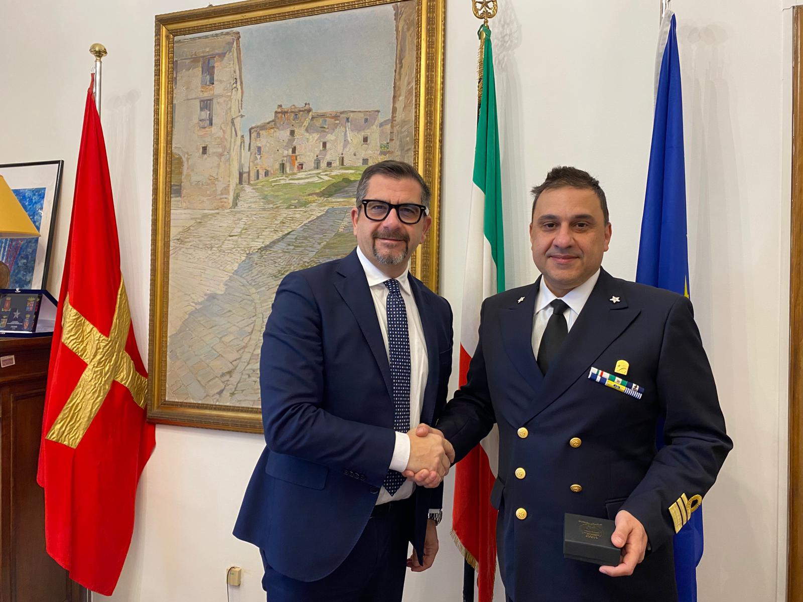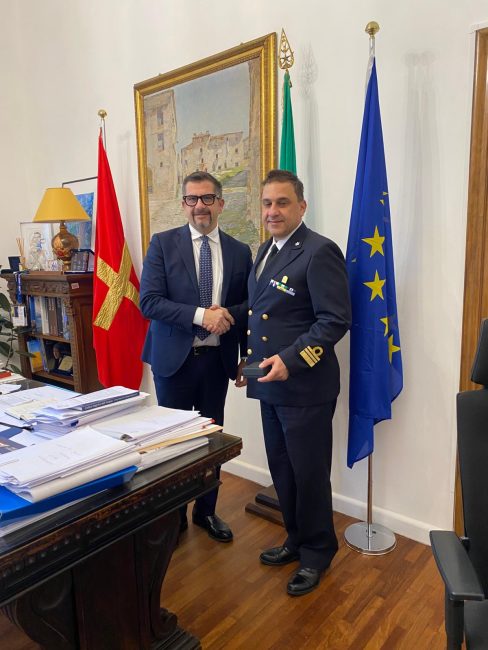 Scambio di saluti istituzionali, questa mattina a Palazzo del Popolo di Ancona. Il sindaco Daniele Silvetti ha ricevuto in Comune e stretto la mano al capitano di fregata Stefano Cesaretti. Si tratta del primo saluto istituzionale dell’anno a Palazzo del Popolo. Il capitano della Marina Militare Cesaretti è il nuovo Ufficiale Dirigente del Deposito Munizioni del Poggio di Ancona.
