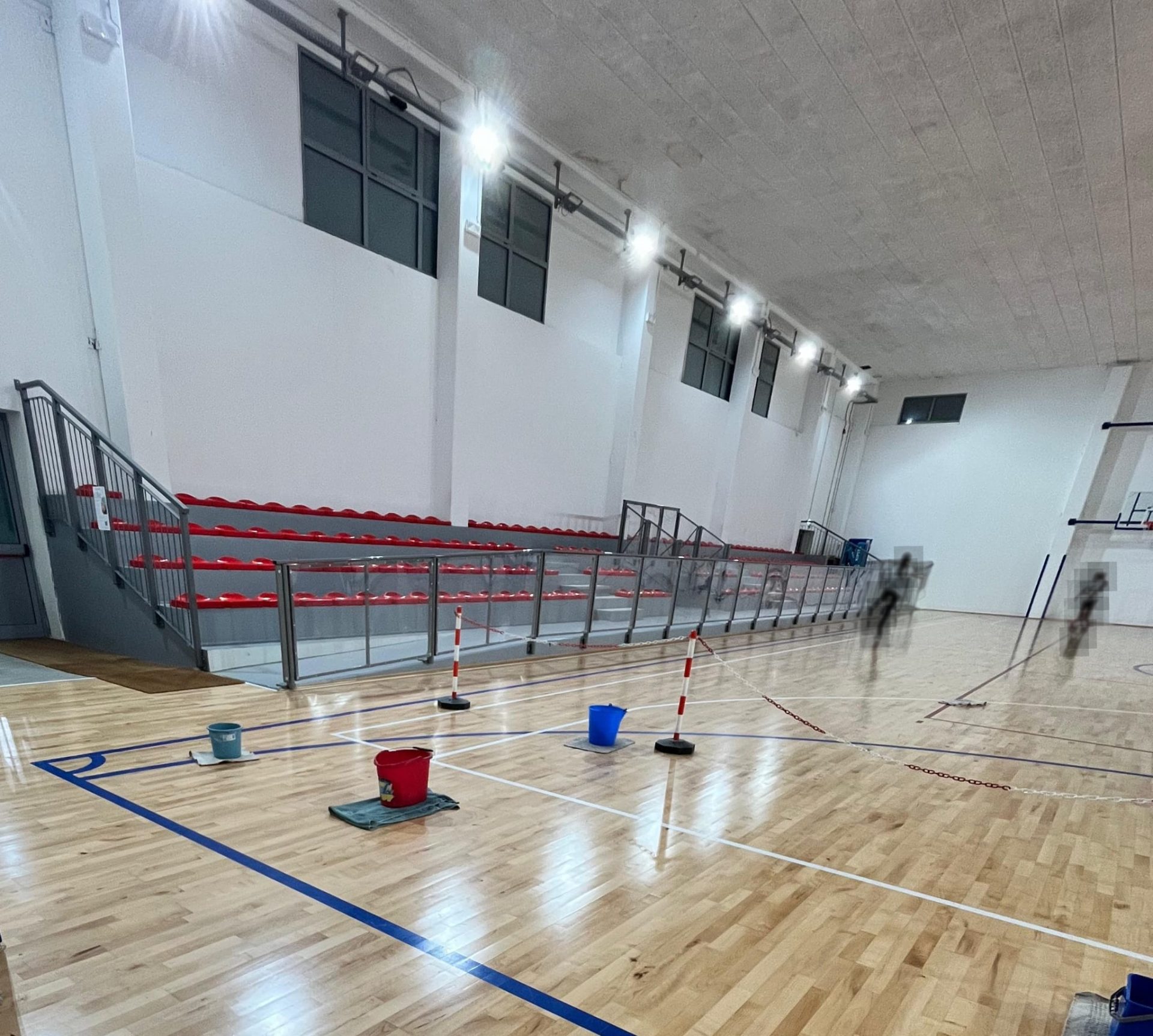 La palestra Carbonari di Jesi con i secchi d’acqua sul parquet