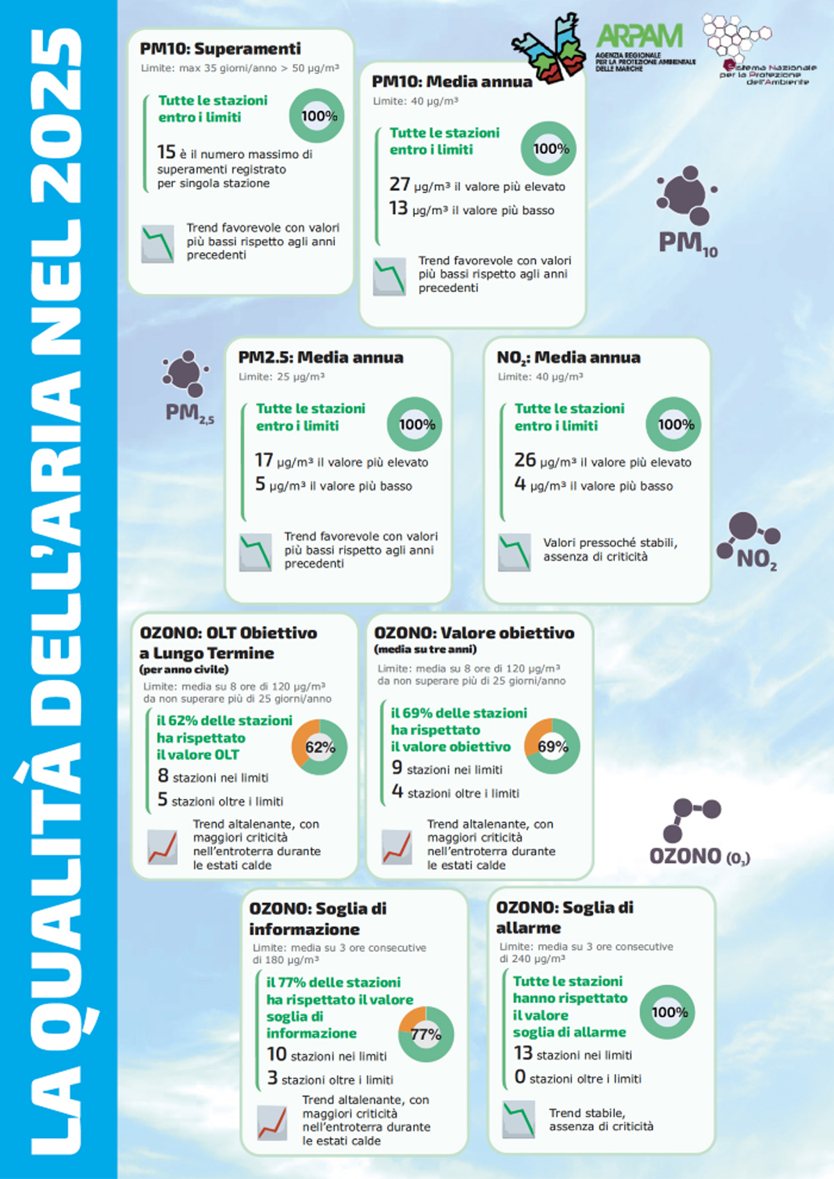 Più aria pulita, meno particolato e biossido di azoto senza preoccupazioni, ma l’ozono continua a rappresentare la principale criticità estiva: è questo il quadro che emerge dalle prime elaborazioni dei dati 2025 della Rete Regionale Qualità dell’Aria delle Marche (Rrqa), diffuse da Arpa Marche in anteprima rispetto alla prossima pubblicazione del report annuale completo. I dati di Arpam dimostrano intanto che nel 2025 la qualità dell’aria nelle Marche registra un netto miglioramento complessivo con la diminuzione del particolato e del biossido di azoto, mentre l’ozono resta la principale criticità, soprattutto nei mesi estivi. Le PM10 segnano il risultato migliore di sempre. Per il sesto anno consecutivo nessuna centralina supera il limite dei 35 giorni oltre i 50 µg/m³ e in sei stazioni non si registra alcun superamento, mentre in altre sette i superamenti restano entro quota cinque. Anche le medie annue di PM10 risultano ampiamente sotto il limite di legge di 40 µg/m³. Città come Pesaro, Ancona Stazione, Macerata e San Benedetto del Tronto fanno registrare i valori più bassi degli ultimi cinque anni.