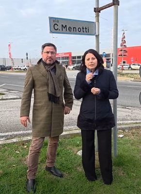 La sindaca Michela Glorio con l’assessore Lorenzo Bottegoni all’incrocio tra via Ciro Menotti e la Statale 16 di Osimo Stazione