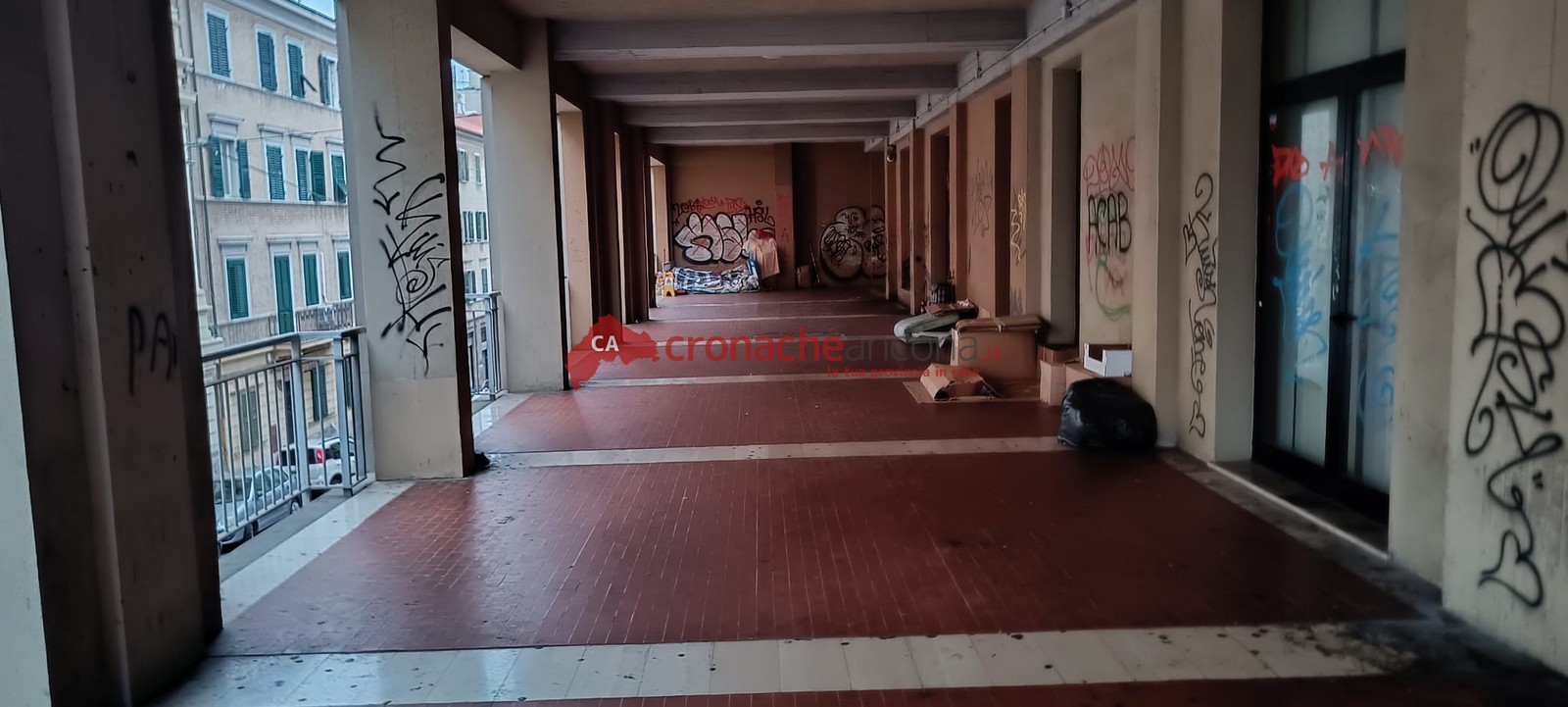 Il porticato che collega via Montebello a via Curtatone, ad Ancona, a due passi da piazza Pertini e dal centro cittadino, sta diventando sempre di più il simbolo di un’incuria che preoccupa residenti e passanti.