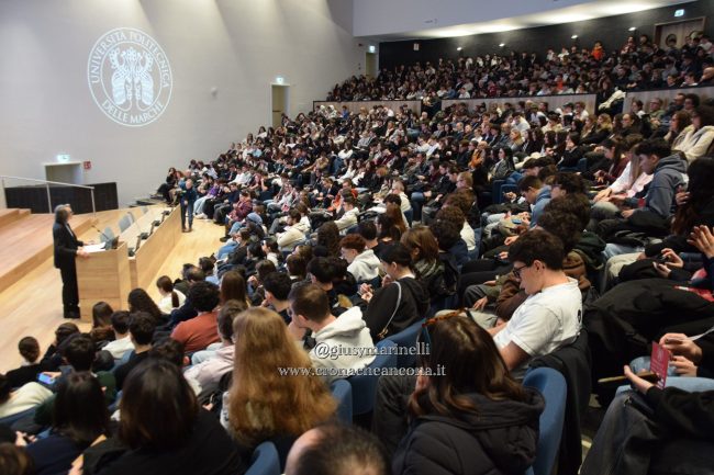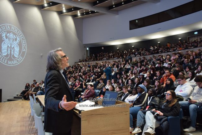 Il rettore Enrico Quagliarini davanti all’aula magna dell’Università politecnica delle Marche, gremita di studenti degli istituti e dei licei del territorio
