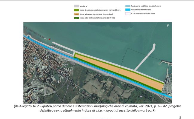 In particolare il parco dunale, di competenza comunale, previsto nella sistemazione superficiale delle aree di colmata, cioè delle zone riempite con i materiali di escavo e create tra la scogliera esterna di protezione e il confinamento interno ferroviario ha una funzione di riqualificazione ambientale e paesaggistica, con l’obiettivo di mitigare l’impatto delle infrastrutture e ricucire il fronte costiero dal punto di vista ecologico. Il Ministero ha chiesto che il progetto del parco sia definito contestualmente all’opera principale, includendo anche piste ciclabili e soluzioni che evitino interferenze con la linea ferroviaria. Nel dettaglio per il parco dunale prevede la realizzazione di «una fascia di larghezza di circa 20 metri di protezione dalle tracimazioni marine; una fascia di circa 25-20 metri avente funzione di filtro dalla viabilità ferroviaria; un’area centrale attrezzata con percorsi ciclo-pedonali» si legge nell’atto.