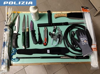 Una volta aperto il portabagagli e perquisito l’interno dell’abitacolo, si sono trovati di fronte ad un vero e proprio arsenale: quattro coltelli, una mannaia, fascette in nylon, catene con bulloni alle estremità, manganelli, punteruoli, taglierini, guanti, cavi elettrici e persino acido cloridrico in modesta quantità. L’uomo non ha fornito alcuna giustificazione plausibile in merito al possesso delle armi né ha specificato dove fosse diretto.