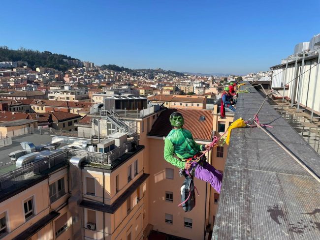 L’iniziativa si è svolta questa mattina presso l’Ospedale Pediatrico Salesi, dove gli operatori del Cnsas Marche, con tecniche alpinistiche in piena sicurezza, hanno effettuato una spettacolare discesa dall’alto lungo l’edificio, portando colori, sorrisi ed energia positiva nei reparti affacciati alle finestre.