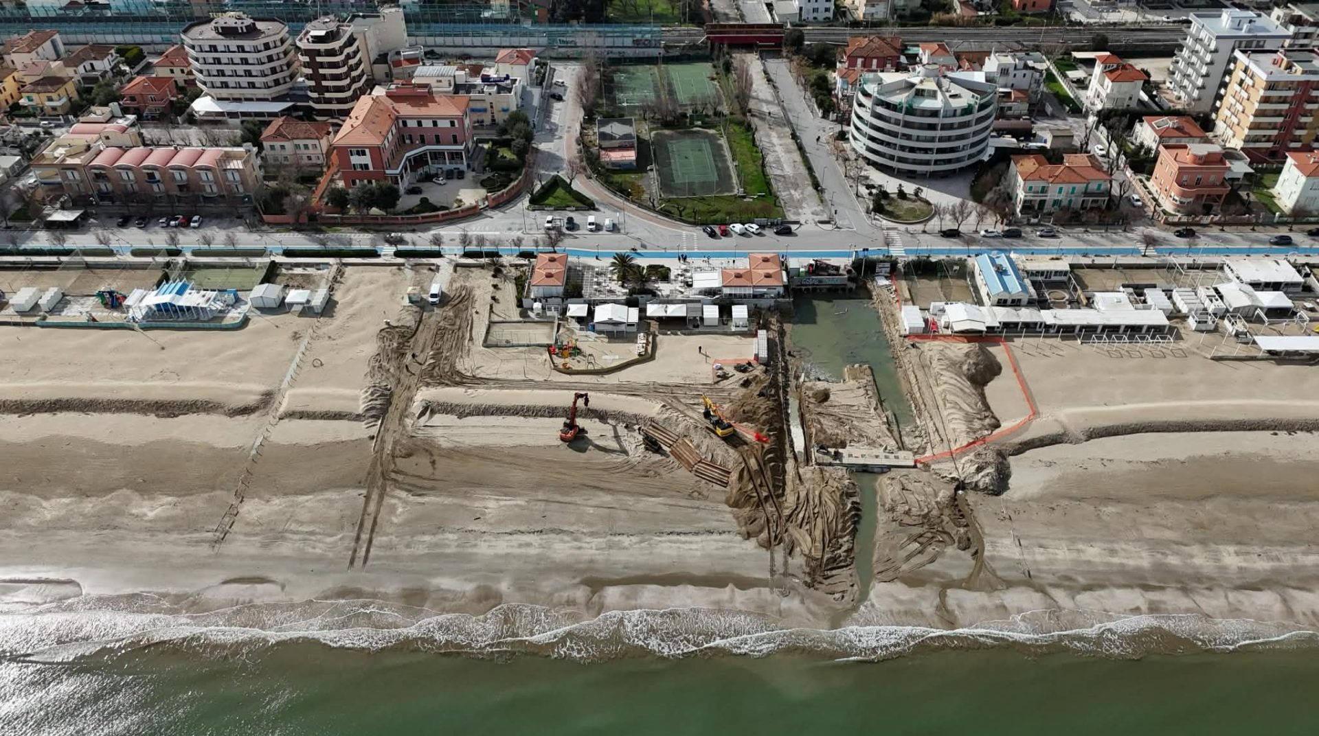 L’intervento in corso prevede la rimozione del tratto tombinato sull’arenile e la realizzazione di un canale a cielo aperto, che consentirà di superare definitivamente i problemi legati all’intasamento delle tubazioni interrate.