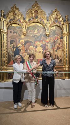 Il sindaco Daniela Ghergo e l’assessore Maura Nataloni all’inaugurazione dello scoprimento della copia restaurata dell’Adorazione dei Magi, l’opera più iconica di Gentile da Fabriano