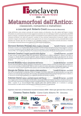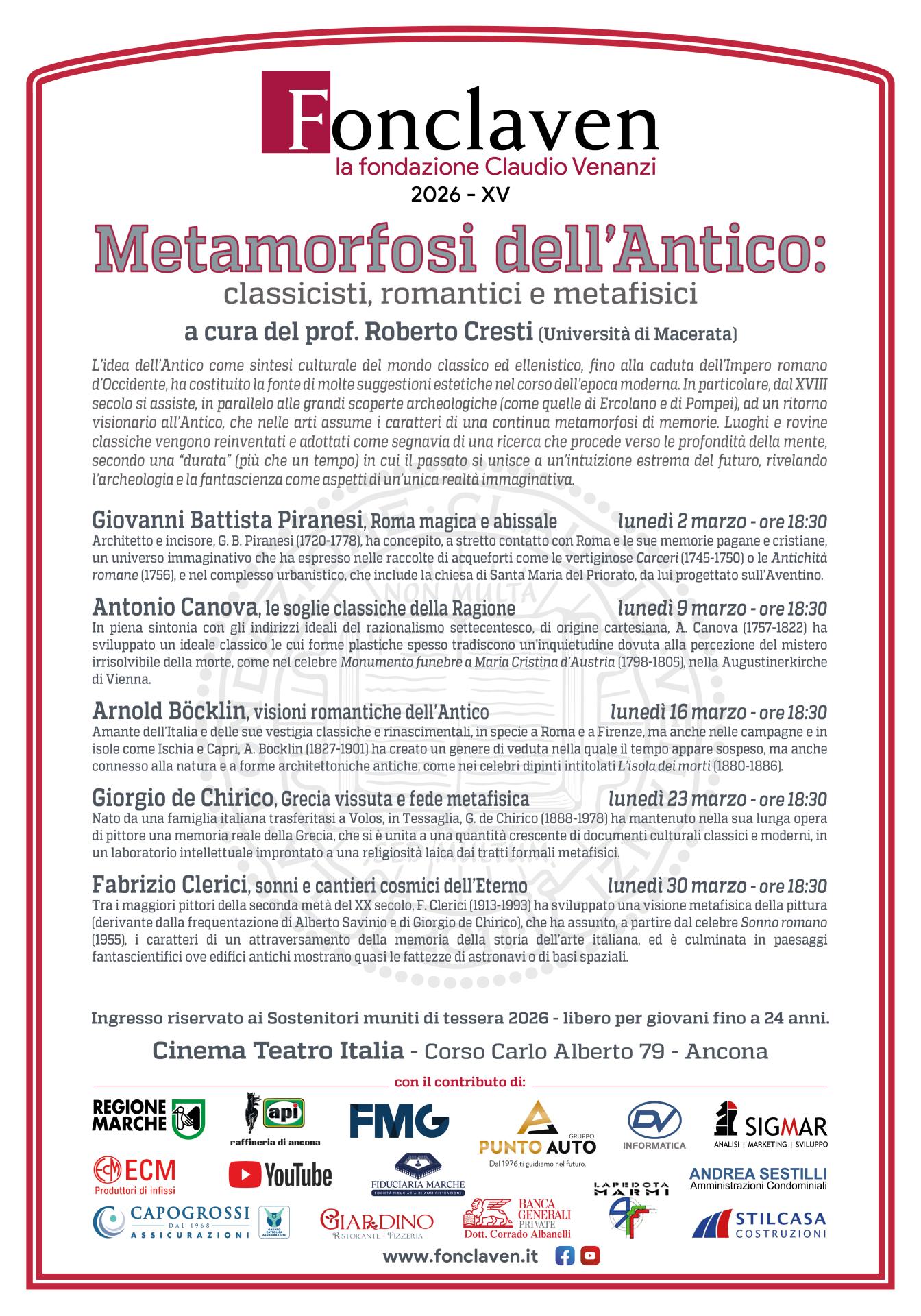 La nuova rassegna, intitolata “Metamorfosi dell’Antico: classicisti, romantici e metafisici”, è curata dal prof. Roberto Cresti dell’Università di Macerata e si terrà presso il Cinema Teatro Italia di Ancona ogni lunedì di marzo alle ore 18.30.