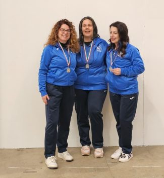 Conny Pinto, Erika Sabatini e Marinella Talevi hanno conquistato l’argento nella gara di classe a squadre Arco Nudo Master Femminile.
