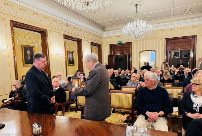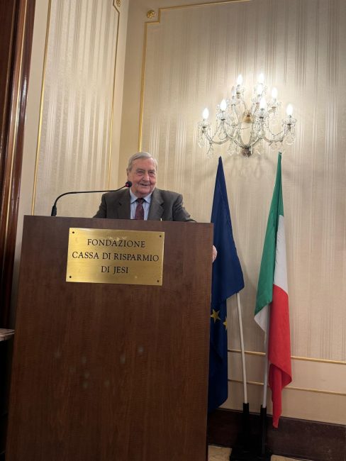 Il momento culminante dell’evento è stato un gesto di rara potenza simbolica. Il fondatore Alfio Bassotti, figura storica che per sessant’anni ha servito le istituzioni – dall’Azione Cattolica giovanile ai vertici delle istituzioni – ha rimesso il suo “mandato” di impegno civile nelle mani dell’attuale vescovo di Jesi, mons. Paolo Ricciardi. Bassotti ha simbolicamente restituito quell’ordine ricevuto negli anni Sessanta da mons. Umberto Ravetta, chiudendo un cerchio di fedeltà e aprendone uno nuovo di testimonianza collettiva. La sala ha accolto con profonda emozione il gesto di Bassotti. Un gesto che non segna la conclusione, ma il compimento consapevole di una vocazione civile vissuta in stagioni, anche complesse, della vita del Paese.