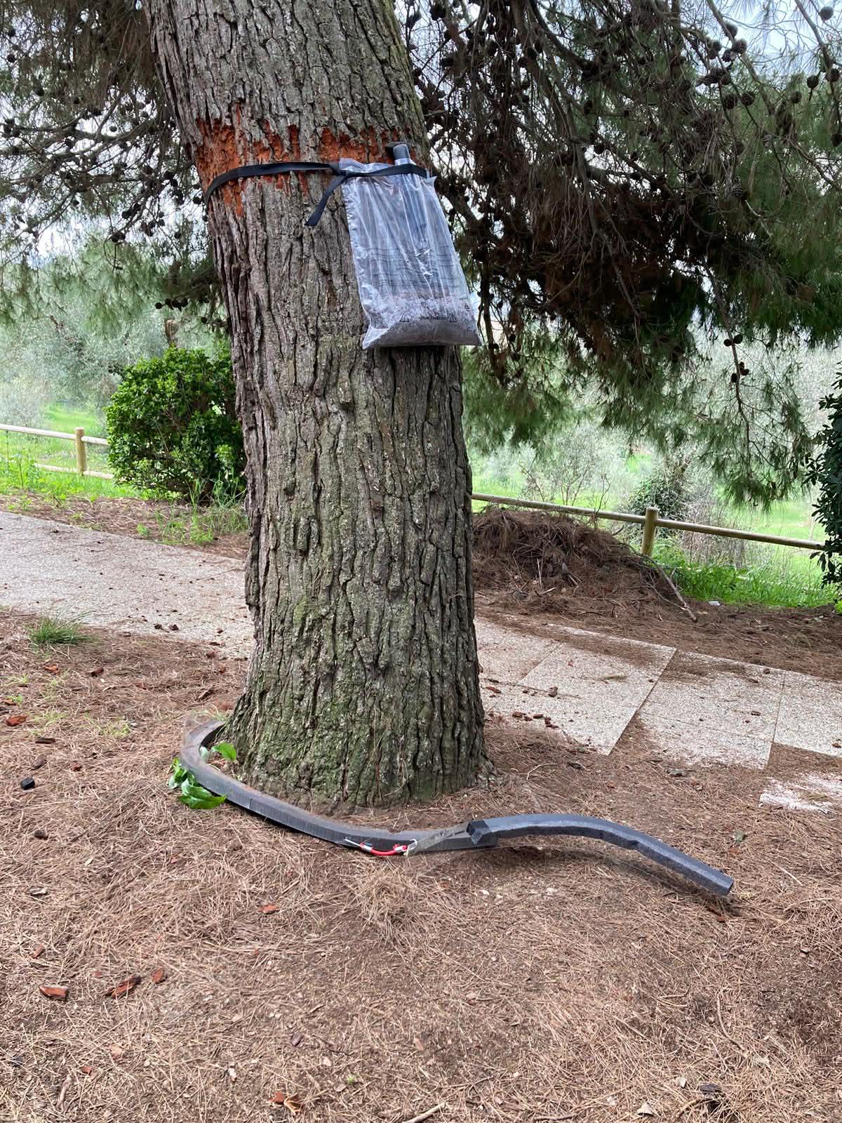 Vandali in azione a Scapezzano, dove hanno tagliato diversi collari messi sui tronchi per contenere la processionaria.