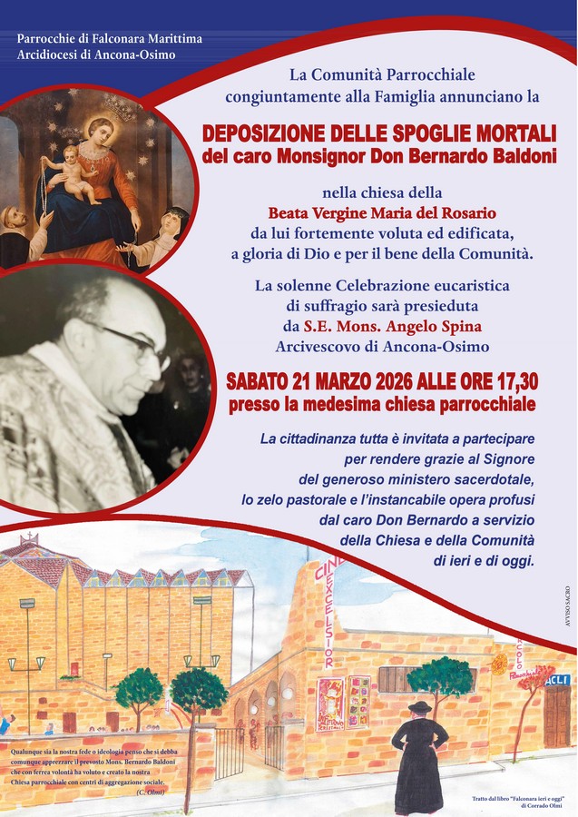 Falconara si prepara a vivere un momento di grande valore simbolico e spirituale. Sabato 21 marzo alle 17.30, nella chiesa della Beata Vergine Maria del Rosario, si terrà la cerimonia di deposizione delle spoglie mortali di monsignor Bernardo Baldoni, figura molto importante per la storia religiosa e sociale della città.