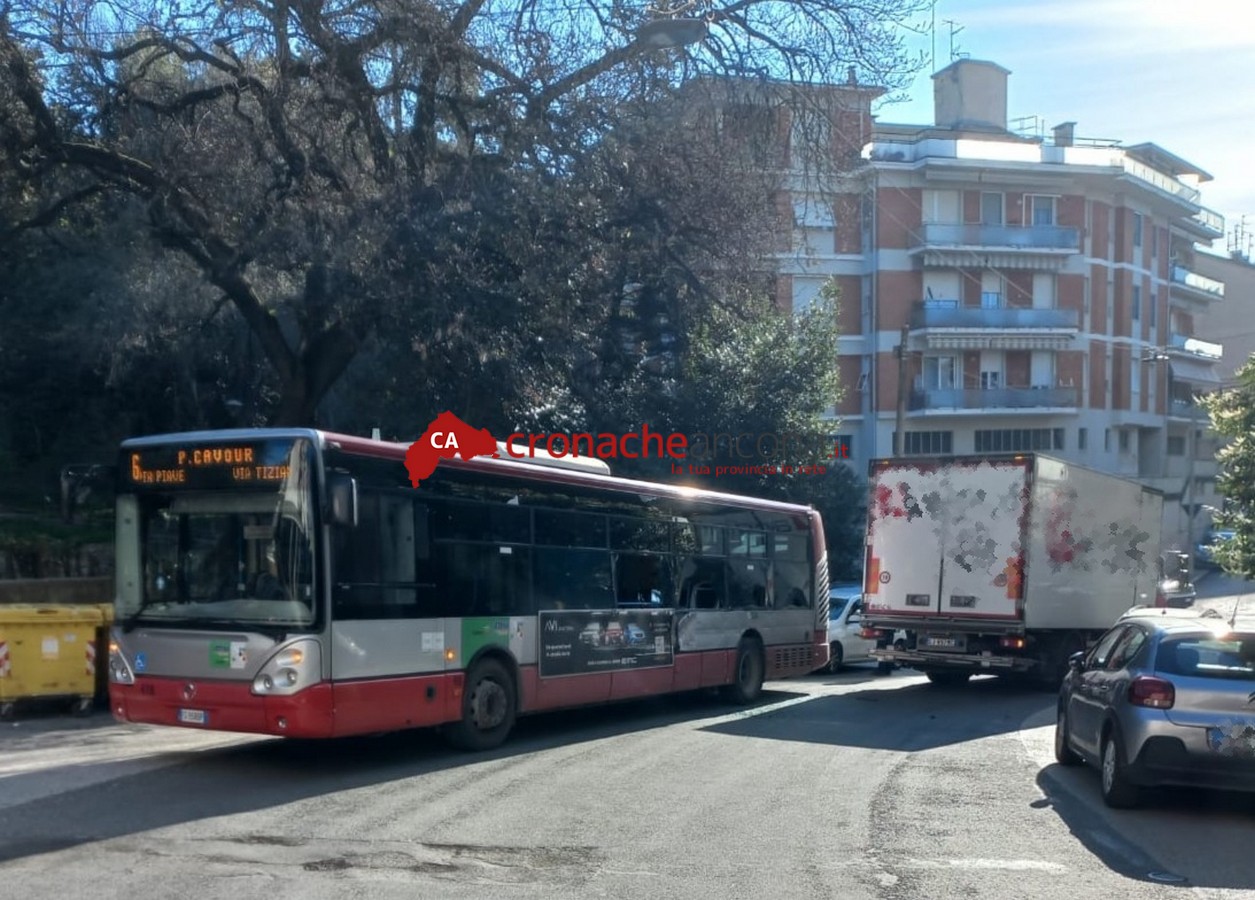 ANCONA - L'incidente è avvenuto nella mattinata. Una giovane passeggera è rimasta lievemente contusa. I vetri di sicurezza del mezzo pubblico hanno evitato conseguenze peggiori per i passeggeri