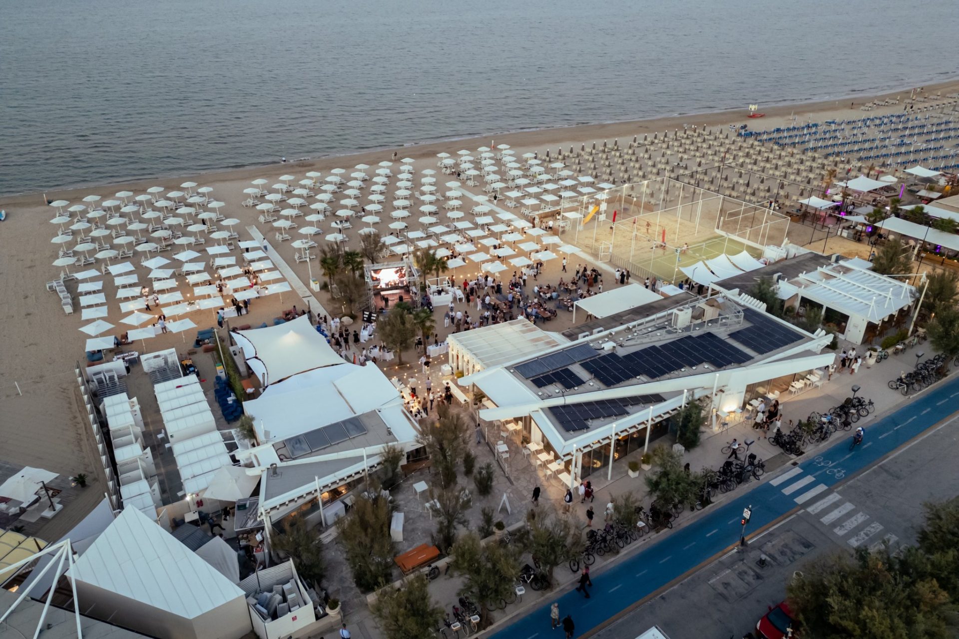 Il progetto presentato dalla Viamameli srl punta su un’estetica moderna e funzionale: un palco in acciaio zincato e legno, affiancato da un’imponente struttura a traliccio alta più di quattro metri che ospiterà un grande schermo led wall. A completare l’allestimento due torri faro da sei metri e un nuovo punto bar in legno bianco, pensato per integrarsi con l’ambiente balneare senza rinunciare a un tocco di design.