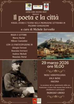 Domenica alle 18, alla Sala Boxe della Mole Vanvitelliana di Ancona, il Lions Club Host celebrerà il suo settantesimo anniversario con una conferenza-spettacolo dal titolo “Il poeta e la città”, dedicata alla poesia, alla storia e al teatro di Palermo Giangiacomi. L’evento si svolge con il patrocinio e il sostegno del Comune di Ancona.