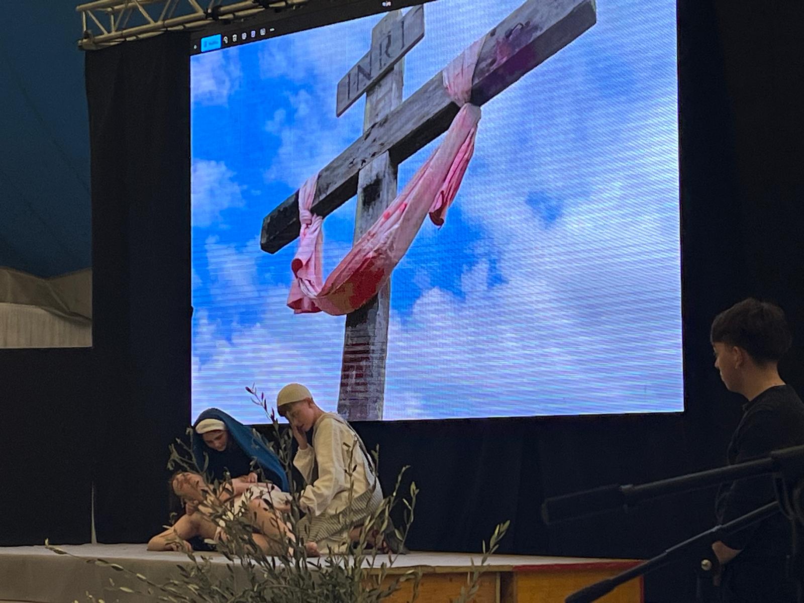 A raccogliere l’invito del Centro Turistico Giovanile Valmusone, che da anni ha in mano l’organizzazione della Passione Vivente di Villa Musone, sono stati circa 70 giovanissimi della Parrocchia di San Flaviano: figuranti in costume tutti tra gli 8 e i 15 anni di età, che hanno interpretato con grande intensità e partecipazione i vari momenti della via Crucis, scanditi con ‘quadri’, ovvero le sacre scene della Passione di Cristo, riprodotte all’interno della tensostruttura di Villa Musone: dal processo nel sinedrio, proseguendo con le stazioni della via Crucis e concludendo con la scena della Pietà dopo la morte di Gesù, i presenti hanno potuto assistere ad un vero e proprio racconto – punteggiato dagli insert del coro, come in una tragedia antica – che ha unito profondità evangelica e autenticità espressiva, dando vita ad una rappresentazione pressoché unica in Italia, proprio per la scelta di affidare alla narrazione e allo sguardo dei più piccoli un evento di tale portata.