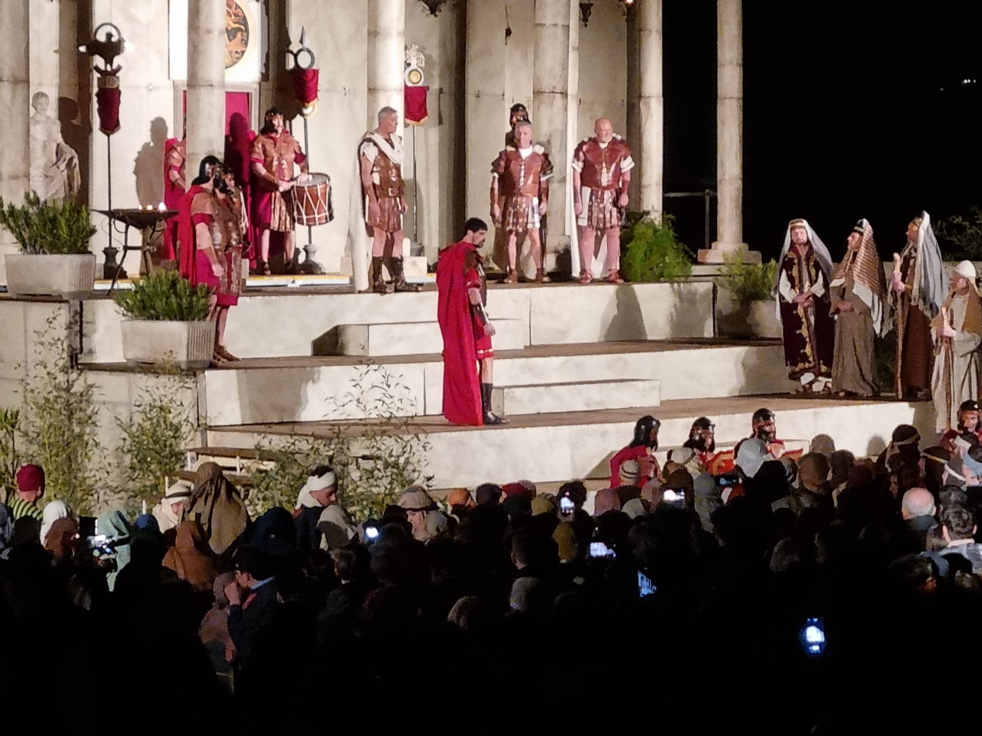 Ancora una volta, dunque, il rito collettivo della Passione Vivente lauretana ha saputo coniugare narrazione evangelica e attualità: da un lato ricostruzione storica fedele, dall’altro elementi di modernità per calare il messaggio devozionale nel presente, fattori che la rendono da sempre un unicum nello sconfinato panorama italiano dei riti della Settimana Santa. Potente il messaggio che è stato lanciato quest’anno dalle pendici del colle lauretano trasformate in Golgota, con oltre 250 figuranti e un totale di 400 persone in movimento: monsignor Nahara, pur non potendo essere fisicamente presente a Loreto (peraltro città gemellata con Nazareth) proprio per via del conflitto in corso, ha voluto affidare al racconto vivente della Passione di Cristo il suo commovente appello alla Pace, nel quale ha parlato della drammatica situazione che stanno vivendo le popolazioni del Medio Oriente, con particolare riferimento a quella della Terra Santa.