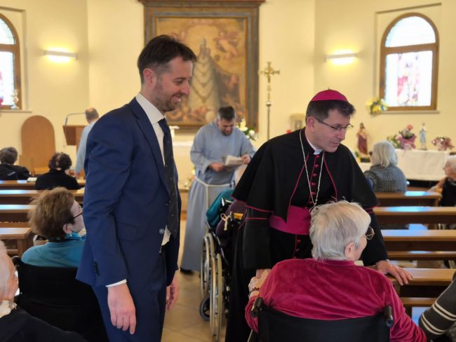L’arcivescovo delegato pontificio di Loreto, monsignor Fabio Dal Cin, a Pasqua ha visitato Casa Hermes ed i suoi anziani ospiti nella giornata di Pasqua. L’alto prelato è stato accolto, tra gli altri, dal presidente delle Opere Laiche Federico Guazzaroni. «Siamo particolarmente orgogliosi della visita di Monsignor Dal Cin che ci ha regalato il giorno della Pasqua a Casa Hermes per dare la benedizione a noi tutti, agli ospiti ai dipendenti e al nostro direttivo» commenta è molto soddisfatto Federico Guazzaroni. «Una dimostrazione della vicinanza, del rispetto reciproco e della stessa collaborazione costruita un questi anni – prosegue – Monsignor Dal Cin ha fatto da noi un passaggio importante salutando ospite per ospite a dimostrazione della sua sensibilità e del legame che si è è rinsaldato nel tempo con la Fondazione e che ci ha fatto davvero particolare piacere» conclude il presidente delle Opere Laiche e di Casa Hermes.