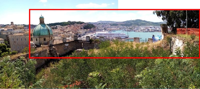 Vista panoramica dal belvedere del Duomo. In rosso la parte che non va compromessa da volumi edilizi evidenziata nella relazione al Dip