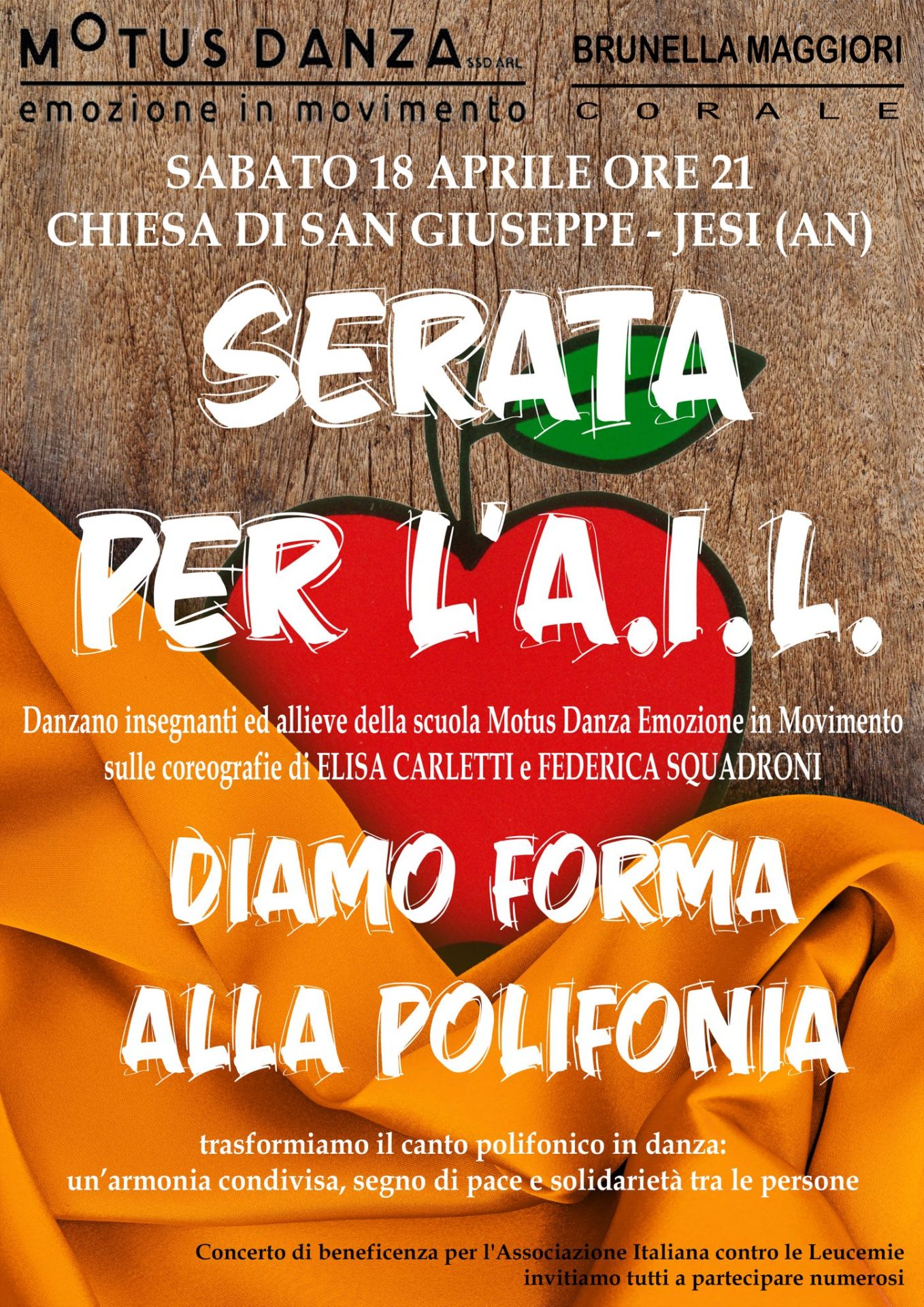 L’iniziativa, che vede la collaborazione tra la scuola Motus Danza “Emozione in Movimento”, e la corale Brunella Maggiori diretta da Stefano Contadini, nasce con l’obiettivo di sostenere l’Associazione Italiana contro le Leucemie attraverso una performance che sfida i confini tra le arti della danza e del canto polifonico L’Arte come Metafora di Comunità Il cuore della serata risiede nell’incontro, raro e prezioso, tra il canto polifonico e la danza contemporanea.