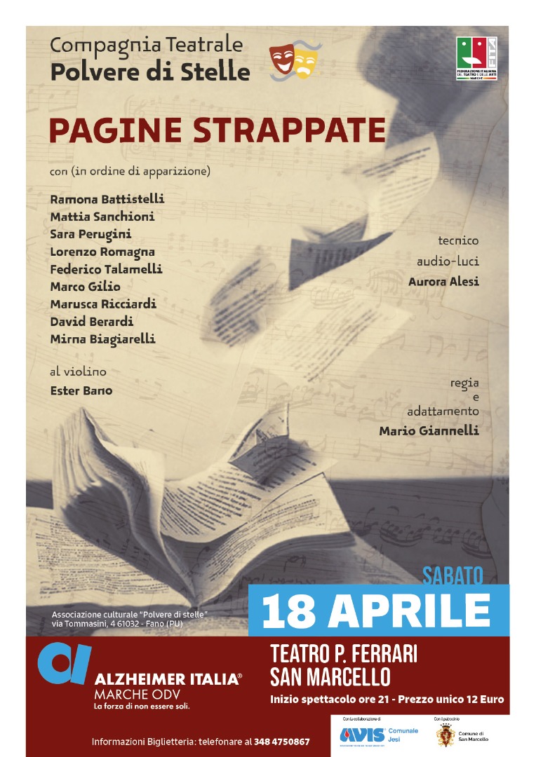 Sabato 18 aprile, alle ore 21, va in scena “Pagine strappate”, al Teatro Ferrari di San Marcello. L’esibizione è promossa dall’Associazione Alzheimer Marche Odv Ets e Avis Comunale di Jesi. Sul palco la compagnia teatrale Polvere di Stelle di Fano porterà in scena tre monologhi e una pièce teatrale dedicati al tema dei bisogni dei malati e delle loro famiglie.