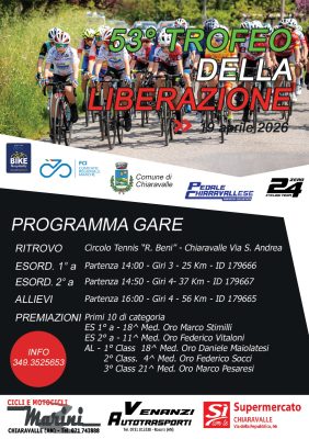 Si svolge ogni anno ad aprile quello che è un “pilastro” della tradizione degli eventi targati Pedale Chiaravallese: il Trofeo della Liberazione. La 53esima edizione – fa sapere un comunicato della Federciclismo Marche – è in programma per domani, domenica 19 aprile a Chiaravalle. Rispetto agli anni scorsi, la data è stata anticipata rispetto alla canonica ricorrenza della festa della Liberazione d’Italia (25 aprile) per evitare la concomitanza con la gara che si disputa a Roma. A Chiaravalle si corre sul consueto percorso ad anello da ripetere più volte con partenze distinte: alle 14:00 la gara degli esordienti primo anno (25 chilometri), che assegna la Medaglia d’Oro Marco Stimilli; alle 14:50 la gara degli esordienti secondo anno (37 chilometri), con la Medaglia d’Oro Federico Vitaloni; alle 16 la gara allievi (56 chilometri) che mette in palio la Medaglia d’Oro Federico Socci, Marco Pesaresi e Daniele Maiolatesi per i primi tre classificati. Ufficialmente sono iscritti 123 allievi, in lizza per la maglia di campione provinciale Fci Ancona, e 86 esordienti tra primo e secondo anno, pronti a lottare e a dare il meglio di sé per conquistare l’ambito Trofeo della Liberazione.