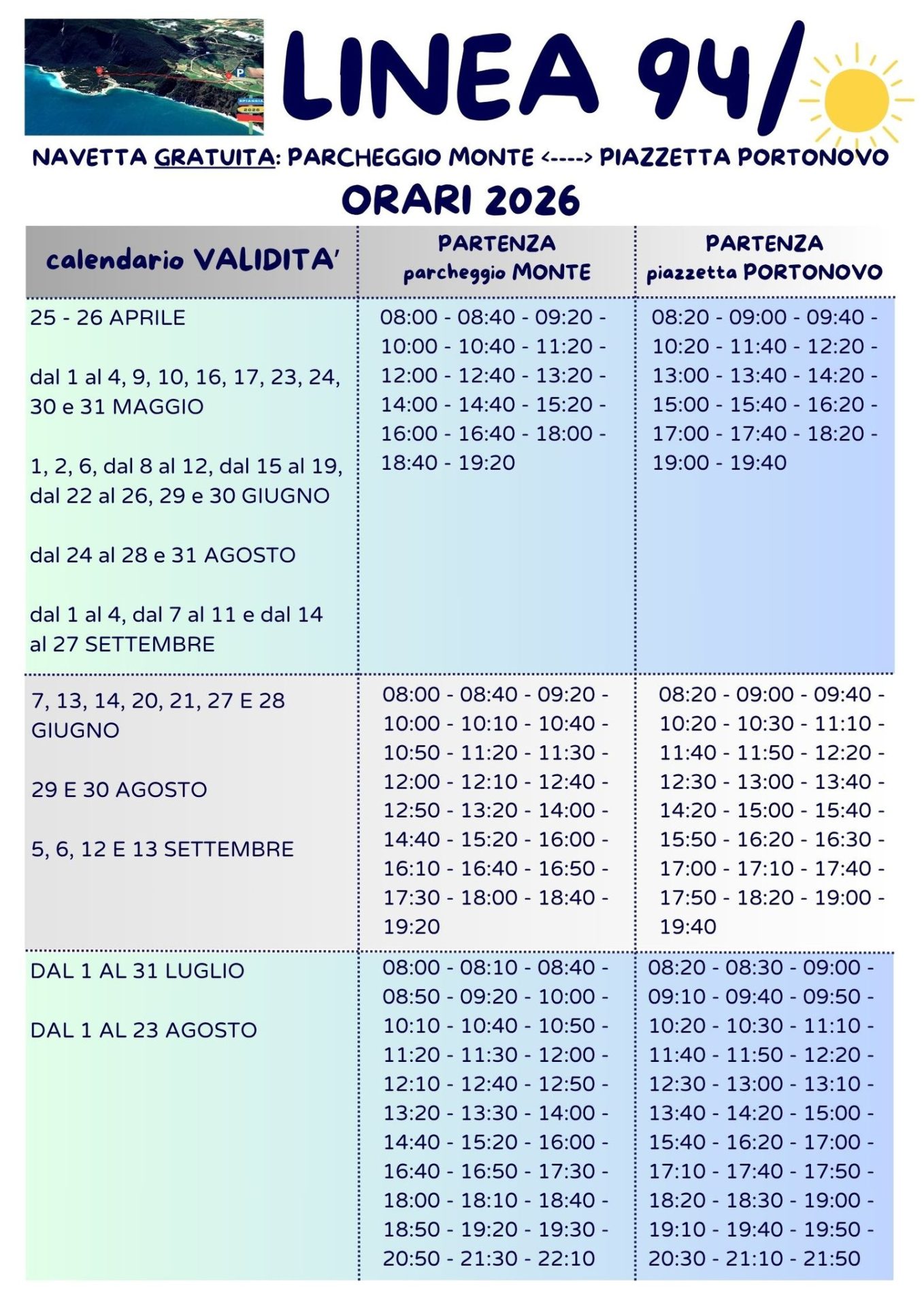Da domani, sabato 25 aprile, a Portonovo sarà operativo il bus-navetta gratuito dal parcheggio a monte fino alla piazzetta. Il servizio proseguirà fino a settembre.
