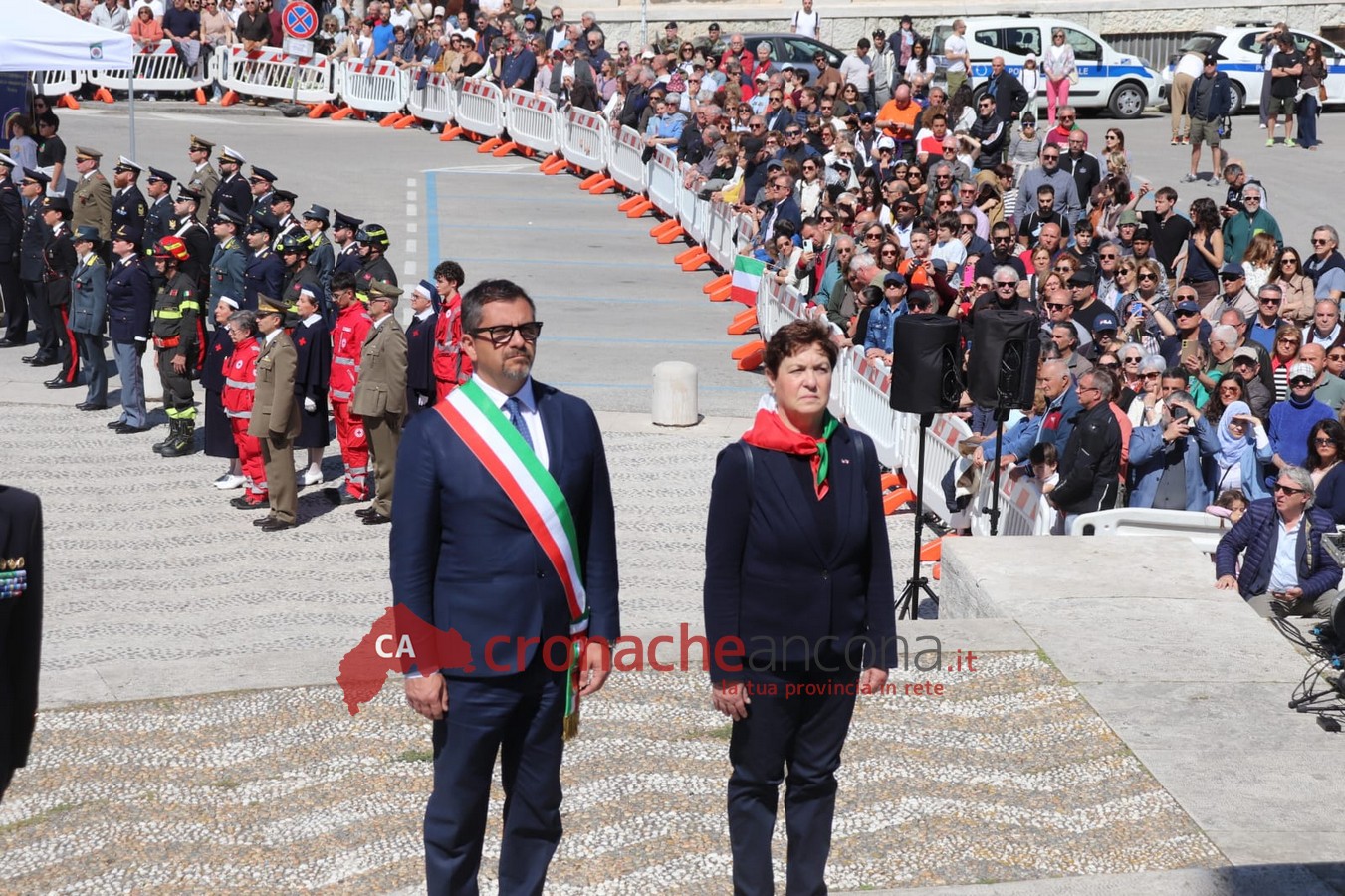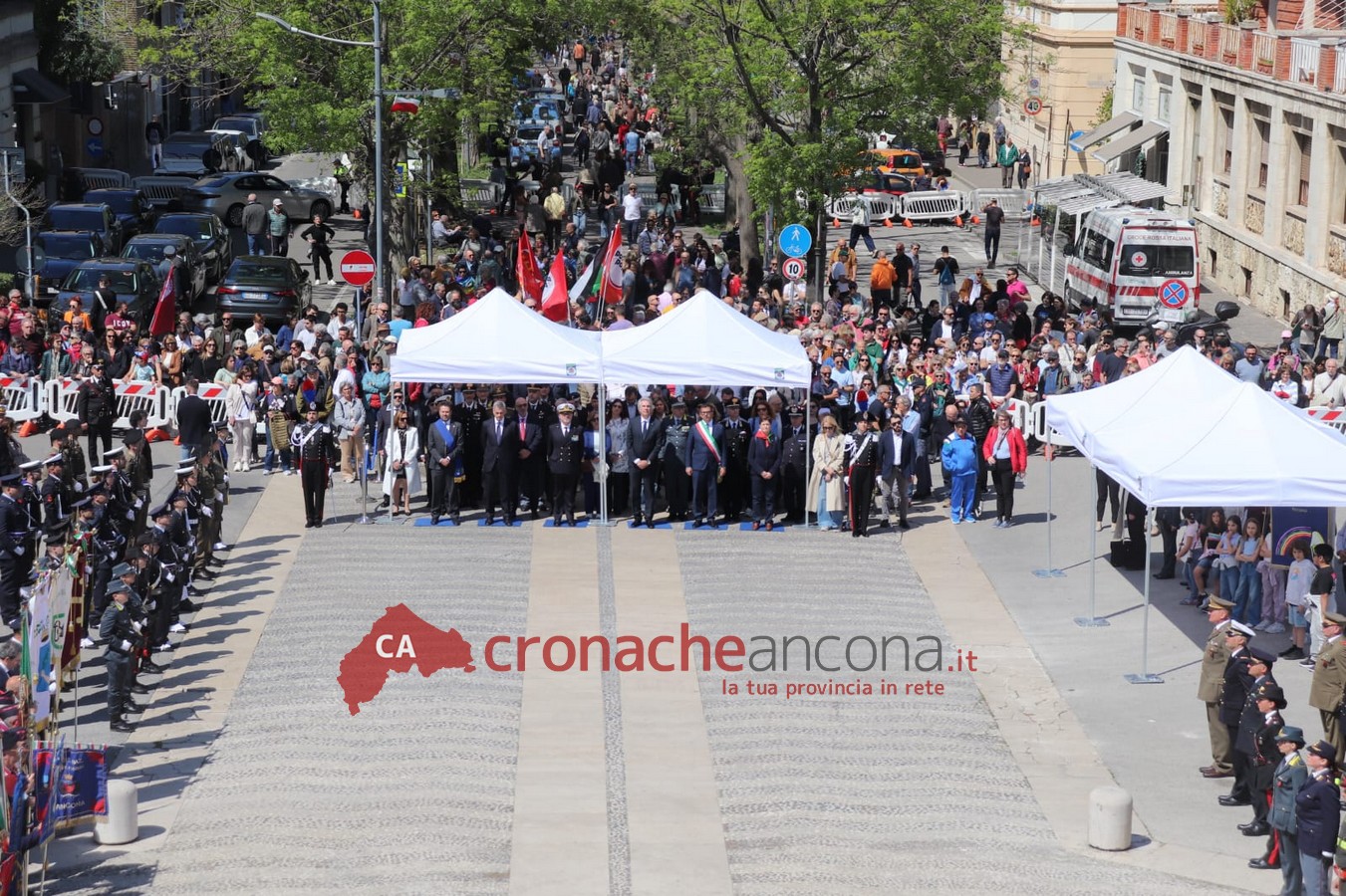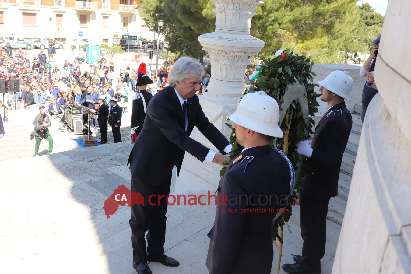 Le commemorazioni si sono svolte al Passetto, davanti al Monumento ai Caduti, con la resa degli onori, l’alzabandiera e il raccoglimento delle autorità civili e militari. Il prefetto Antonio Valiante ha accompagnato la corona di alloro fino al luogo della deposizione.