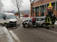 CERRETO D’ESI – Lo scontro è avvenuto questa mattina alle 6.30 sulla Sp 256 Muccese. A bordo dell’auto viaggiava una coppia di Jesi, sul pulmino quattro operai del cantiere della Pedemontana Fabriano-Muccia. Sul posto per i soccorsi i mezzi del 118, dei vigili del fuoco di Fabriano e dei carabinieri
