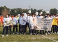L’OMAGGIO dell’Asd Montecosaro al 16enne, attaccante della squadra Allievi, morto giovedì alla stazione di Loreto, travolto da un treno. I compagni hanno esposto uno striscione in sua memoria e una maglietta con tutte le firme prima della partita della prima squadra