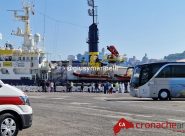 L’ATTRACCO poco prima delle 10 alla banchina 19 per poi procedere con le operazioni di sbarco e il trasferimento al PalaBrasili di Collemarino dove avverranno le procedure di identificazione e i controlli sanitari