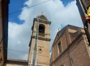 CASTELFIDARO – L’intervento in piazza Giacomo Leopardi è stato effettuato con l’ausilio di un’autoscala proveniente da Ancona per operare in sicurezza a circa 25 metri d’altezza