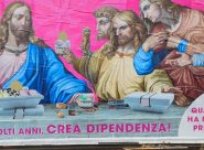 IL CASO – Il manifesto di una gelateria è comparso a Porto San Giorgio, riprende uno scorcio del capolavoro di Leonardo, con la scritta “Da molti anni crea dipendenza”. Dure critiche della Curia: «Inopportuno associare il gelato all’Eucarestia, soprattutto nella settimana santa»