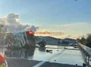 ANCONA – Ferito il conducente, accompagnato a Torrette. Il mezzo trasportava mosto d’uva. Disagi alla viabilità e code di 3 chilometri