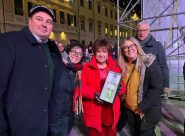 SENIGALLIA – Blitz in piazza Garibaldi di una delegazione da Arcevia per consegnarle la versione marchigiana della sua bevanda preferita. La cantante ha ringraziato apprezzando il gesto