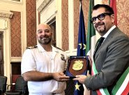 ANCONA – Oggi pomeriggio il capitano di fregata, Samuele Mondino, in visita a Palazzo del Popolo ha donato al primo cittadino il crest con il motto della nave “Faventibus ventis”